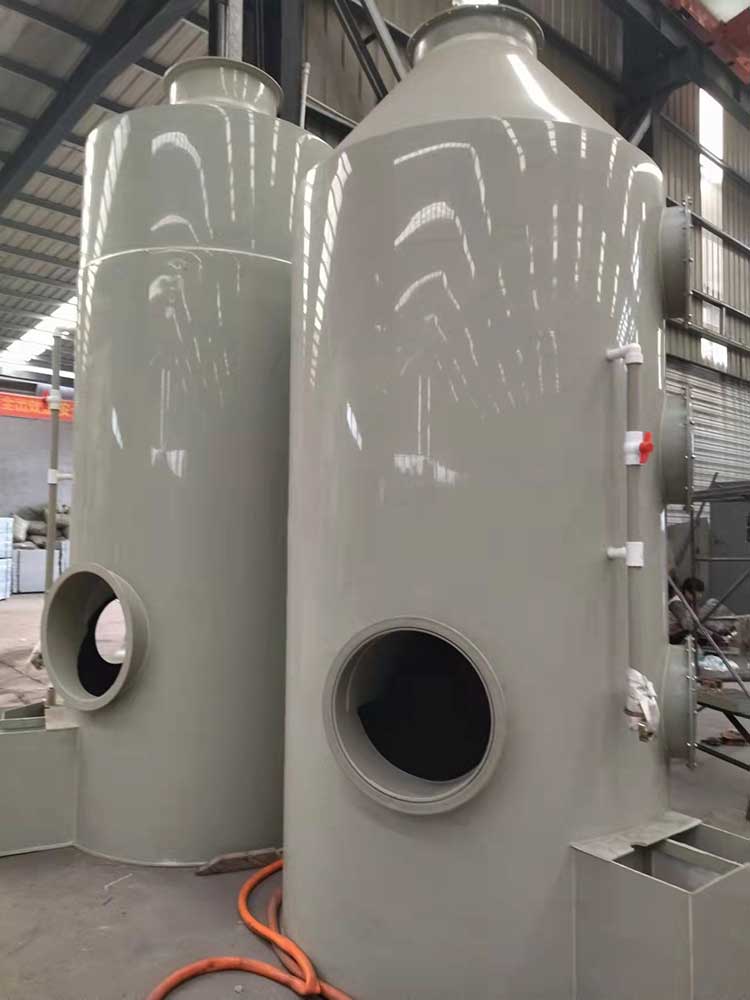 一、噴漆房廢氣處理噴淋塔一般使用pp板制作而成。噴淋塔采用圓形塔體,用法蘭分段連接而成。設備由水箱、塔體、水泵、進風口、噴淋層、填料層、旋流除霧層、出風口、觀檢窗口等組成。