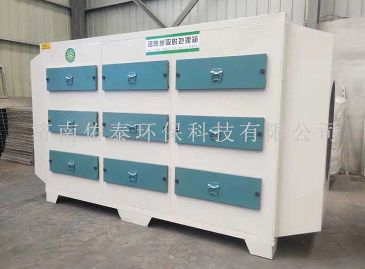 當廢氣由風機提供動力,負壓進入環保箱后進入活性炭吸附層,由于活性炭吸附劑表面上存在著未平衡和未飽和的分子引力或化學鍵力,因此當活性炭吸附劑的表面與氣體接觸時,就能吸引氣體分子,使其濃聚并保持在活性炭表面,此現象稱為吸附。利用活性炭吸附劑表面的吸附能力,使廢氣與大表面的多孔性活性炭吸附劑相接觸,廢氣中的污染物被吸附在活性炭表面上,使其與氣體混合物分離,凈化后的氣體高空排放。活性炭環保箱是一種干式廢氣處理設備,由箱體和填裝在箱體內的吸附單元組成。