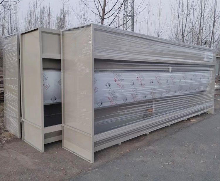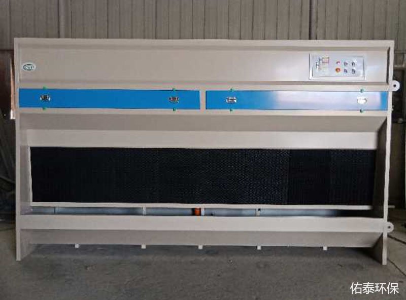 L5.0*W0.9*H2.1(m),面板1.0厚鍍鋅板噴塑,水池1.5mm鍍鋅板噴塑。水簾201不銹鋼。一層噴淋,一層浮球。電控箱一個。水泵一個,風(fēng)機4臺。