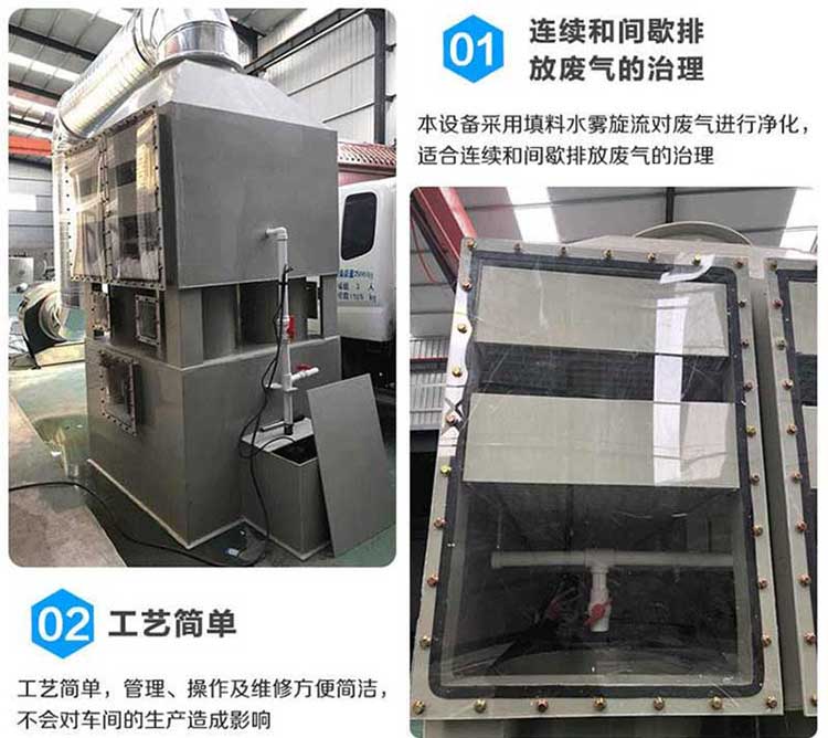 方形旋流凈化塔是普通噴淋塔的升級版,設計更加人性化,填料與清理更加方便,可重復使用,適合于連續(xù)和間歇排放廢氣的治理。工藝簡單,管理、操作及維修更加方便簡潔,不會對車間的生產造成任何影響,同時酸霧吸收器適用范圍更廣,除霧效果更好。